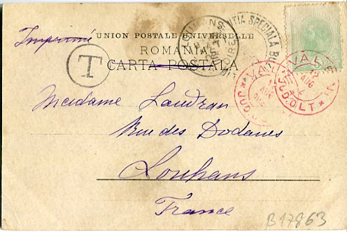 Romania: 1902 (12 August). Postcard titled ‘Bucuresci Mitropolia’ (ed. Rommler Jonas) to France franked with 5b and tied by red VALENI datestamp, 16 August Louhans arrival cds and circulat “T” postage due handstamp.
