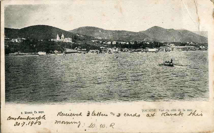 British Levant: 1903 (30 July). Picture postcard titled TOUAPSE (Tuapse, Russia) to Wales franked with 1d GB stamp and tied by BPO Constantinople datestamp and oval BLAIR CAMPBELL & Co merchant cachet as well as 4 August Portmadoc arrival cds.