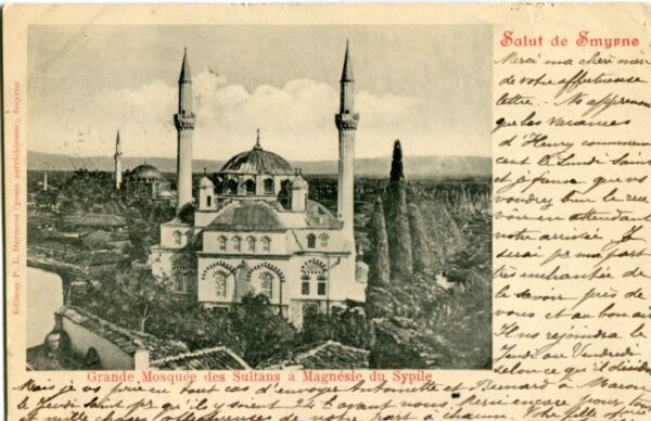 French Levant: 1903 (28 March). Postcard titled ‘Grand Mosquee des Sultans a Magnesie du Sypile. Smyrne’ to France franked with 10c LEVANT inscribed French stamp tied by SMYNE TURQUIE D’ASIE datestamps and 31 March Vereux arrival cds. ed. P.L. Dermont
