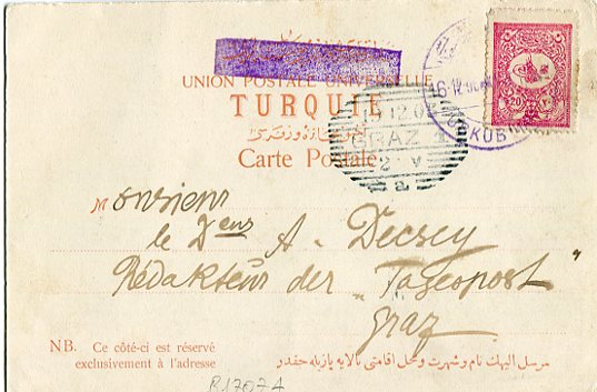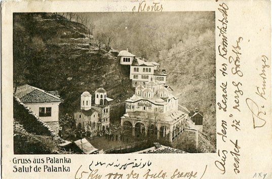 Ottoman Bosnia: 1903 (16 December). Gruss Aus Palanka [today Kriva Palanka] postcard to Austria franked with 20pa of 1901 issue for external mail tied by ÜSKÜB (TEMURYOLU SUBESI – USKUB (GARE) (A&P type 3) railway station datestamp and 19 December Graz arrival cds.