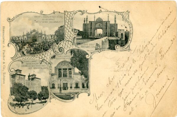 Iran: 1903 multi view PROVISIORE 1319 handstamped 5ch picture stationery card to Belgium struck by Teheran datestamp, Baku transit and Bruxelles arrival cds’s. ed. A. Fischer