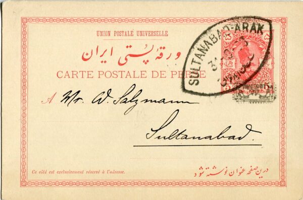 Iran: 1903 (31 September). PROVISOIRE 1319 handstamped 5ch Mozaffareddin Shah Qajar portrait postal stationery card struck by SULTANABAD – ARAK datestamp. Reverse blank. Philatelic but still scarce. PC16B