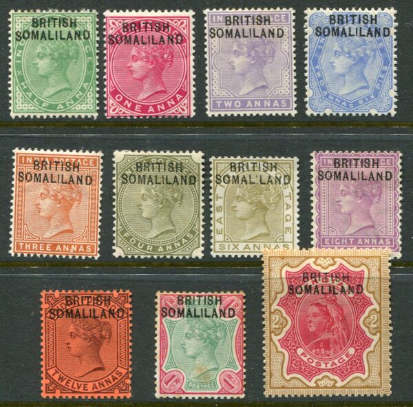 Somaliland: 1903 (1 June). Stamps of QV India overprinted “British Somaliland” at top mint o.g. values to 2r. 6a with SOMAL.LAND variety. 1r. heavy foxing. Sg. 1/11, 7var.  *