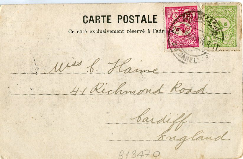 Ottoman Turkey: 1903 (26 November). Postcard titled ‘Les bateliers pres la Douane de Galata’ to England franked with 10pa and 20pa of 1905 external use issue tied by Kala-i Sultaniye – Dardanelles datestamp and next day Istanbul cds.
