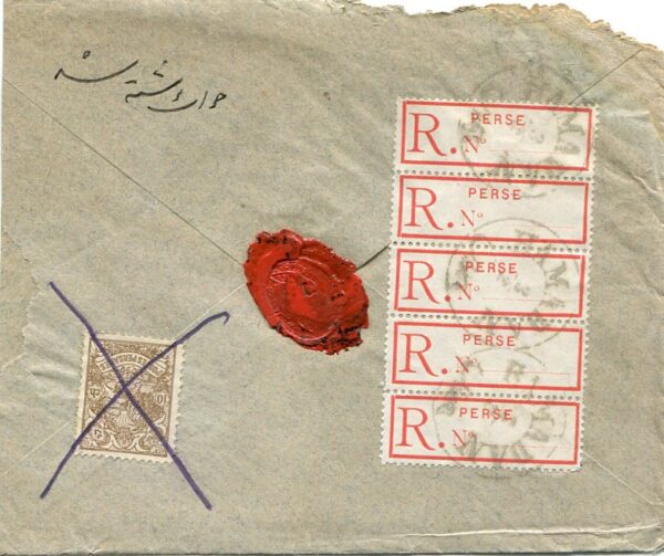 Iran: 1903 cover to Teheran franked with strip of five registration label used as One Shahi tied by Hamadan datestamps and 10ch coat of arms crossed out. Reverse arrival cds.