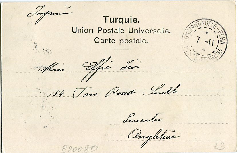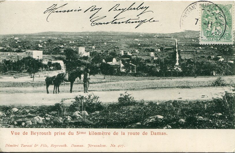 French Levant: 1904 (7 February). Postcard titled ‘Vue de Beyrouth prise du 5eme kilometre de la route de Damas’ (ed. Dimitri Tarazi) to Leicester, England franked with 5c LEVANT inscribed French stamp tied by Constantinople – Galata datestamp.