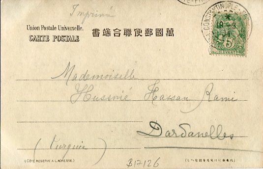 French Levant: 1904 (19 March). Japanese postcard to Dardanelles franked with 5c Levant inscribed French stamps tied by Constantinople – Galata datestamp.