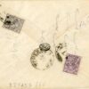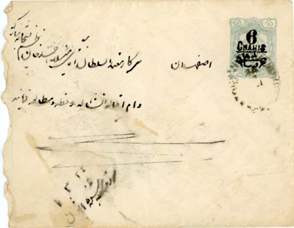 Iran: 1904 coat of arms 6ch. surcharged on 10ch. postal stationery envelope franked on reverse with 1ch and 2ch, all tied by Teheran Maidan datestamps.