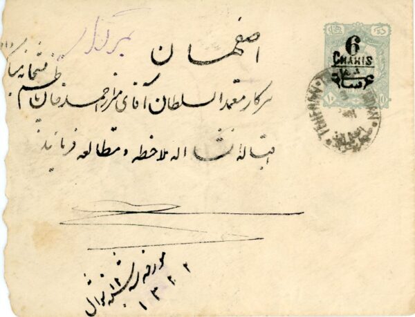 Iran: 1904 coat of arms 6ch. surcharged on 10ch. postal stationery envelope struck by Teheran Maidan datestamp