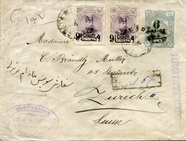 Iran: 1904 (15 July). 6ch surcharged on 10sh postal stationery envelope uprated with two 9ch on 1Kr for registration to Switzerland tied by Sultanabad datestamp and oval Agence Ziegler & Co. handstamp with date. Reverse Teheran transit and 3 August Zurich arrival cds.