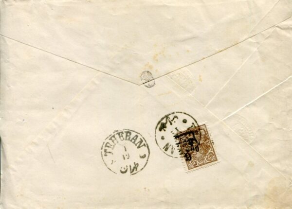 Iran: 1904 cover franked with 6ch surcharged on 10ch coat of arms stamps of 1904 tied by Teheran datestamps and on reverse oval KURDISTAN arrival datestamp.