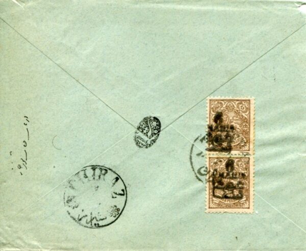 Iran: 1904s cover franked with pair of 6ch on 10ch surcharged coat of arms stamps of 1904 tied by Teheran datestamp and Chiraz arrival cds.