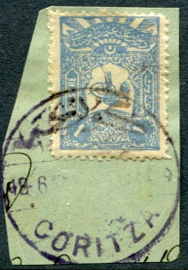 Ottoman Albania: 1pi small tughra issue of 1905 on piece struck by GÖRICE – CORITZA (vilayet Monastir, A&P type 5, G&G 56, AL51) datestamp.