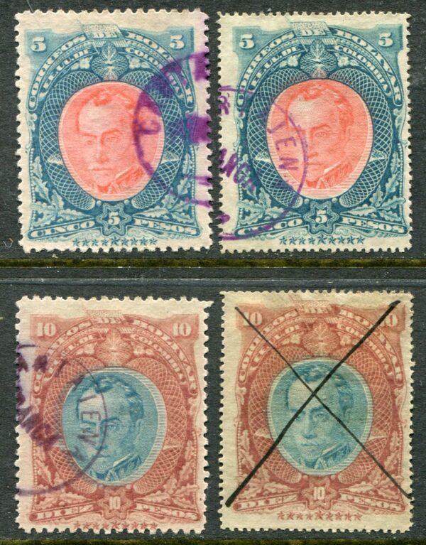 Colombia – Bolivar: Dated 1905 Simon Bolivar portrait used 5c and 10c perf. 12 and perf.16 set. Sc. 35, 35b, 36, 36b