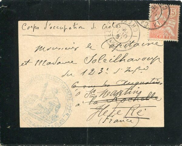 French Levant – Crete: 1905 (19 October). Mourning cover to France franked with CRETE inscribed 15c French Levant stamp tied by LA CANEA – CRETE datestamp and French Occupation Command censor cachet. Reverse 26 October Charente arrival cds.
