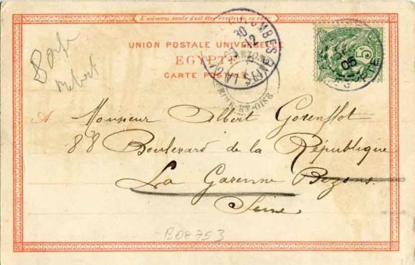 Egypt: 1905 (22 December). Postcard to France franked with French Post Office in Alexandria 5c green tied by Alexandrie Egypte datestamps alongside 30 December arrival cds’s. Sg. 23