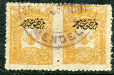 Ottoman Iraq: Pair of 5pa printed matter overprinted 1905 small tughra issue struck by part MENDELI (vilayet Baghdad, A&P type 1, IRQ 145) datestamp in black. No document up to this date with this type recorded.