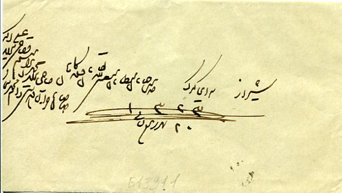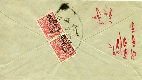 Iran: 1905 (24 May). Cover franked on reverse with pair of 3 CHAHIS surcharged on 5ch of 1903 Arms issue tied by oval BOUCHIR datestamp. Sg. 277