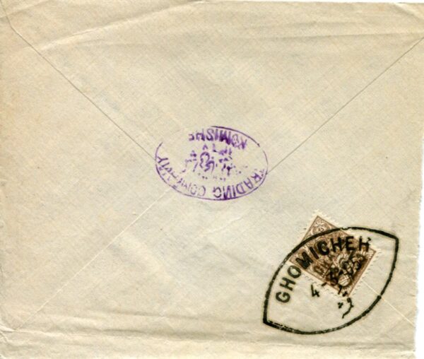 Iran: 1905 cover franked with 6ch surcharged on 10ch coat of arms stamps of 1904 tied by GHOMICHEH (today Shahreza) oval datestamps and Komishe Trading Company hand cachet.