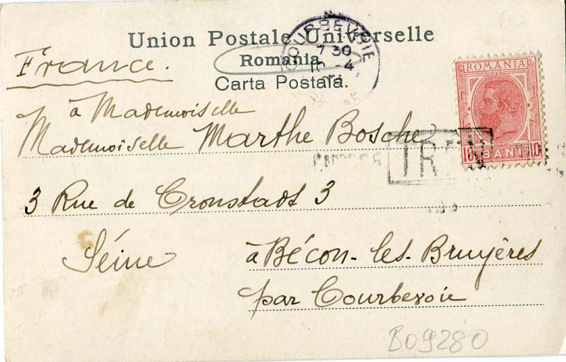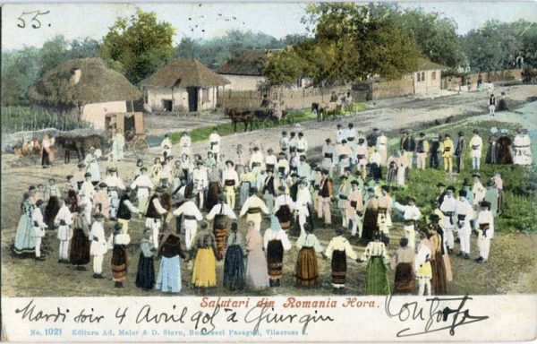 Romania: 1905 (4 April). Postcard titled ‘Salutari din Romania Hora’ (ed. Maier & Stern #1021) to France franked with 10b and tied by boxed TREN (Train) railway handstamp alongside 10 April Courbeville arrival cds.