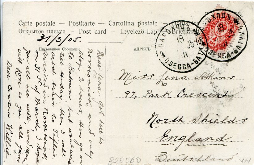 Russia – Ukraine: 1905 (31 March). Postcard titled ‘Caucasus’ to England franked with 4k and tied by oval ODESSA – BATUM datestamp.
