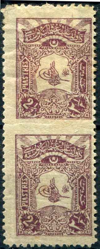 Ottoman: 1905 (1 September). Tughra with Rays definitive issue 2 1/2pi mint o.g. vertical pair with imperf between error. Isfila 232 DE17