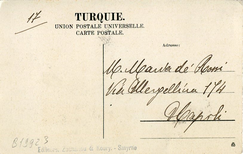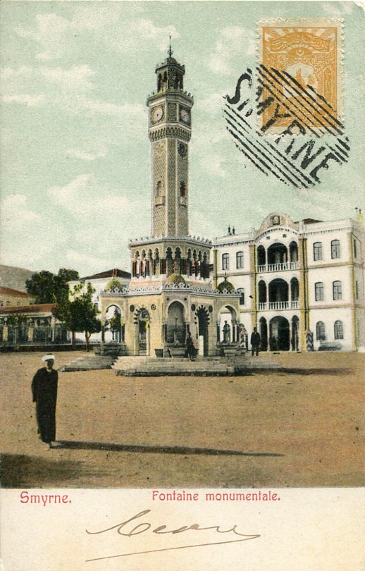 Turkey: c1905 postcard titled ‘Smyrne. Fontaine monumentale’ (ed. Zachariou & Kory) to Napoli, Italy franked with 5pa of 1905 definitive tied by SMYRNE (A&P type 43) handstamp.