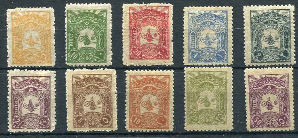 Ottoman: 1905 (1 September). Small Tughra with Rays definitive issue perforation 12 mint o.g. set of ten. Isfila 227/236