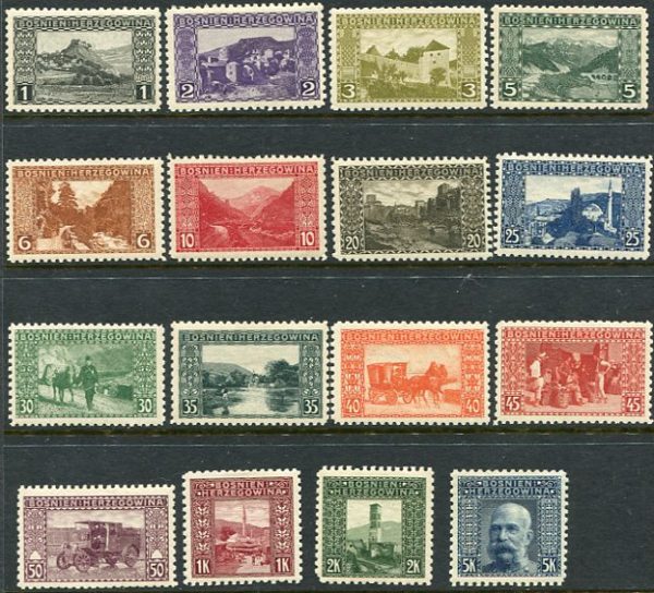 Bosnia and Herzegovina: 1906 (1 November). Pictorials issue perf. 9 1/2 mint o.g. set of 16. Sg. 186B/201B