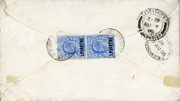 British Levant: 1906 (2 August). Registered cover to England franked with pair of 1pi Turkish currency surcharged 2 1/2d perf. 14 KEVII stamps tied by BPO Constantinople datestamp, 7 August Manchester transit and same day Levenshulme arrival cds’s. Sg. 25