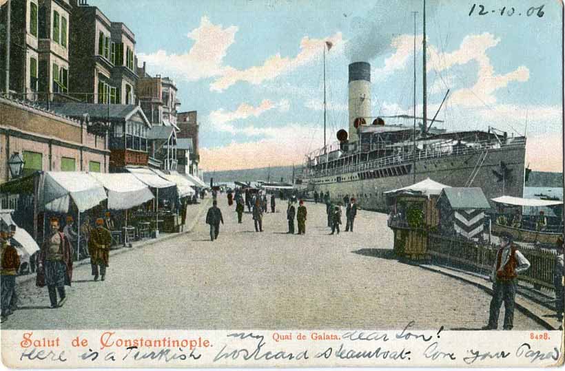 British Levant: 1906 (11 October). Postcard of Galata Port to Ventnor, Isle of Wight franked with 1d LEVANT opt GB stamps and tied by BPO Constantinople cds.