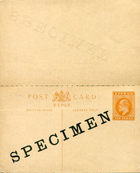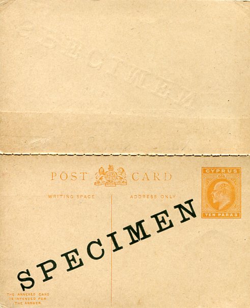 Cyprus: 1906 (19 September). KEVII 10pa+10pa Reply Paid Card overprinted SPECIMEN. Only 732 prepared. I&P 15s