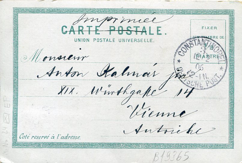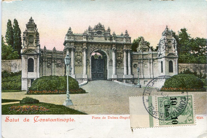 German Levant: 1906 (12 February). Postcard titled ‘Constantinople. Porte de Dolma-Bagtche Palace’ to Vienna franked with 10pa Turkish currency surcharged bottom marginal 5pf German stamp tied by Constantinopel datestamp.