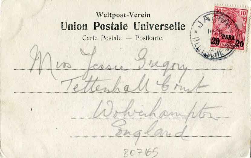 German Levant: 1906 (1 August). Picture postcard of Jaffa to England franked with 20pa on 10pf German stamp tied by JAFFA * DEUTSCHE POST datestamp.