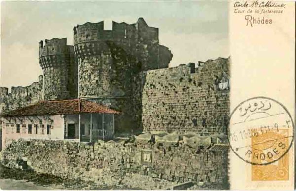 Ottoman Greece: 1906 (15 Nov). Picture postcard titled Tour de la forteresse Rhodes franked with 5pa and tied by RODOS – RHODES (A&P type 6, R) date stamp. Reverse neither message nor postmark.