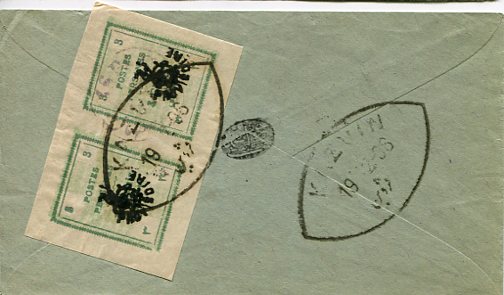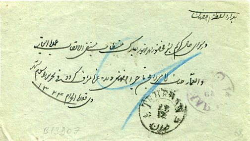 Iran: 1906 (19 December). Cover to Kashan franked on reverse with pair of PROVISOIRE control handstamp on 3ch type-set issue for internal rate tied by oval KAZVIN datestamp, 22 December Teheran transit and 29 December arrival cds’s. Scarce as multiple. Sg. 294