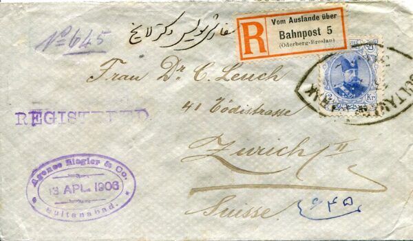 Iran: 1906 (13 April). Registered cover to Switzerland franked with 2Kr. Mozafereddin Shah Qajar portrait tied by oval Sultanabad Arak datestamp and Agence Ziegler & Co. handstamp with date and Oderberg – Breslau Bahnpost 5 railway registration label affixed on transit. Reverse Teheran and Breslau transit and 3 May Zurich arrival cds’s.