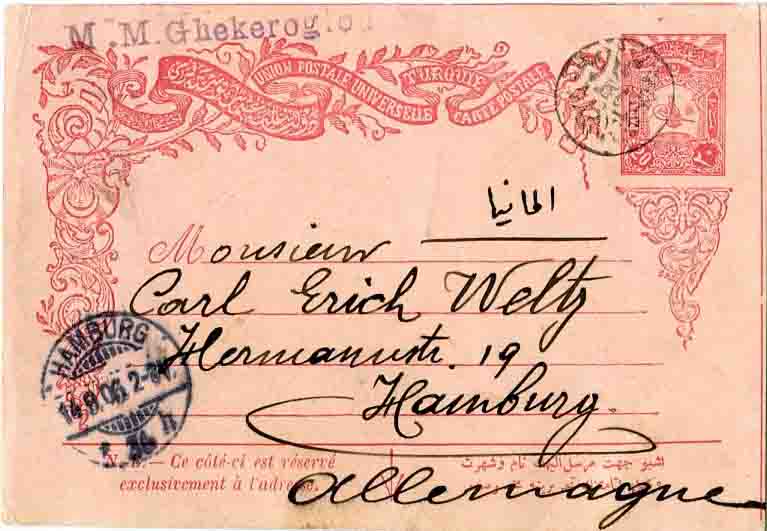 Ottoman Turkey: 1906 (2 Sept). 20pa postal stationery card to Hamburg, Germany tied by ADANA POSTA SEYYAR MEMURU (A&P type 503, RRR) railway TPO negative seal alongside 14.9 arrival cds.