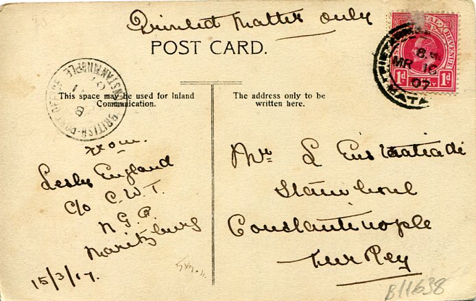 1907 British Levant Postcard from Natal