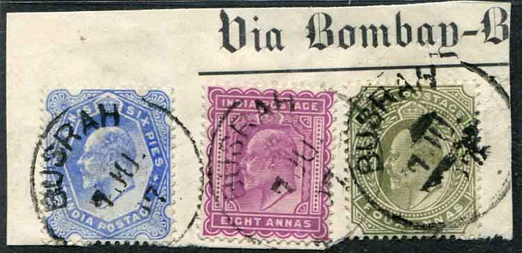 Iraq: 1907 (7 June). India Used Abroad 4a. olive, 8a. purple and 2a.6p. ultramarine on piece cancelled by superb Proud type D6 BUSRAH date stamps. Sg. Z163, Z165, Z167