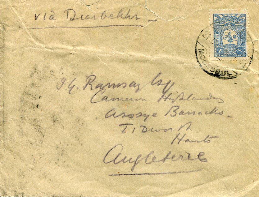 Ottoman Iraq: 1907 (21 December). Cover to England franked with 1pi of 1905 definitive tied by MUSUL – MOUSSOUL (A&P type 5) datestamp and by manuscript on top via Diyarbakir. Reverse 12 January 1908 Andover arrival cds.
