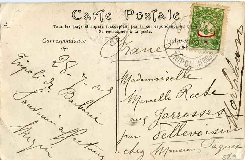 Ottoman Libya: 1907 (28 July). Picture postcard titled ‘Desert du SAHARA – Dans les Dunes’ franked on reverse with 10pa foreign use overprinted issue for ten paras postcard rate to Indre, France tied by TRABLUSGARB – TRIPOLI (AFRIQUE) (A&P type 7) bi-lingual datestamps and 5 August arrival cds.
