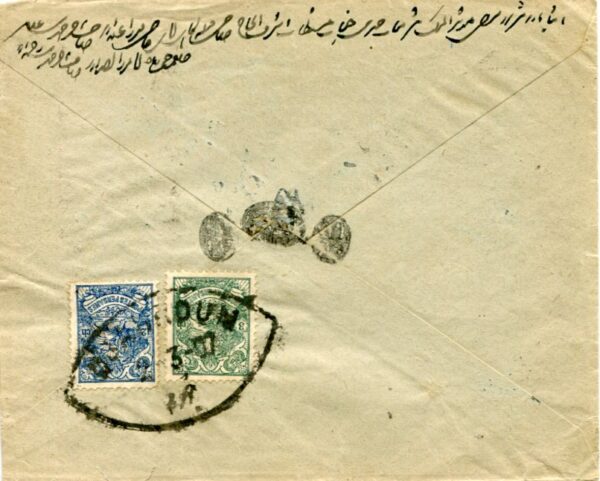 Iran: 1907 cover to Tehran franked with 3ch and 12ch coat of arms stamps tied by oval DJAHROUM datestamp. Reverse arrival ds.