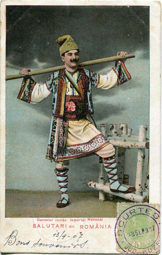 Romania: 1907 (13 September). Postcard titled ‘Dansator roman importul National’ (ed. Depositul Universal) to France franked with 5b and tied by violet SCURTESTI * JUD. BUZEU’ and BUZEU datestamps.
