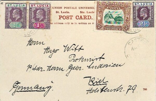 Saint Lucia: 1907 picture postcard ‘Natives Taking Water’ to Kiel, Germany franked KEVII ½d., 1d. and 2½d. plus commemorative 2d ‘The Pitons’ tied two cds, slight toning around some perfs.