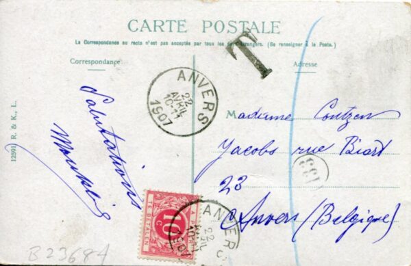 Turkey: 1907 (11 April). Postcard titled ‘Constantinople. Ambassade de France a Therapia’ (ed. R&K, L) to Belgium franked with 10pa of 1905 issue and tied by Constantinople datestamp. On arrival struck by ‘T’ postal tax handcachet and fee collected with 10c postage due stamp tied by 22 April Anvers datestamps.