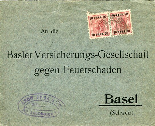 Austria Levant: 1908 (24 April). Commercial cover to Switzerland franked with pair of 20pa Turkish currency surcharged on 10h without varnish bars Austrian stamp tied by Salonich datestamp and LEON JUDA * SALONIQUE merchant cachet. Reverse 27 April Basel arrival cds.