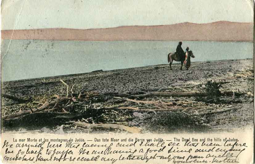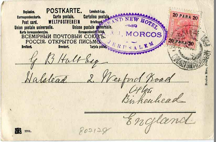 Austrian Levant: 1908 postcard of Dead Sea (ed. Boulos Meo) to Birkenhead, England franked with 20pa surcharged on 10h Austrian stamp with varnish bars tied by Jerusalem datestamp and struck by Grand New Hotel violet cachet.