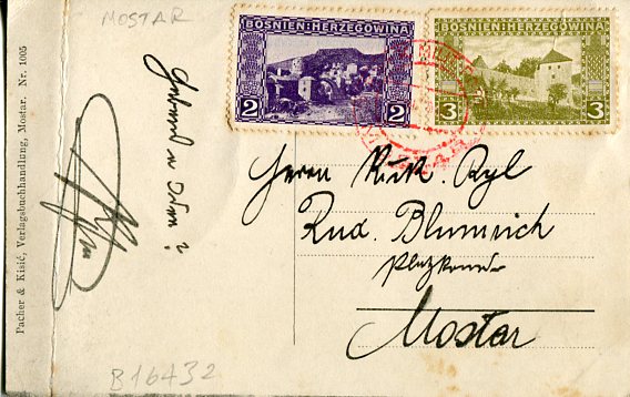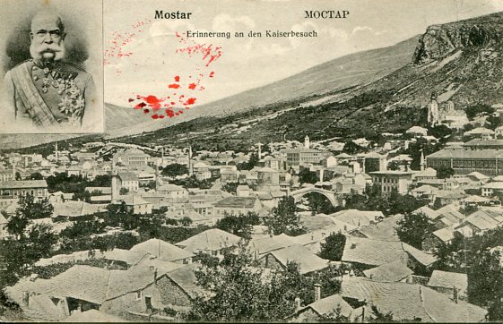 Bosnia and Herzegovina: 1908 postcard titled ‘Mostar. Erinnerung an den Kaiserbesuch’ (ed. Pacher & Kisic #1005) used locally franked with 2h and 3h perf. 12 1/2 pictorials tied by red Austrian Military Post MOSTAR datestamp.
