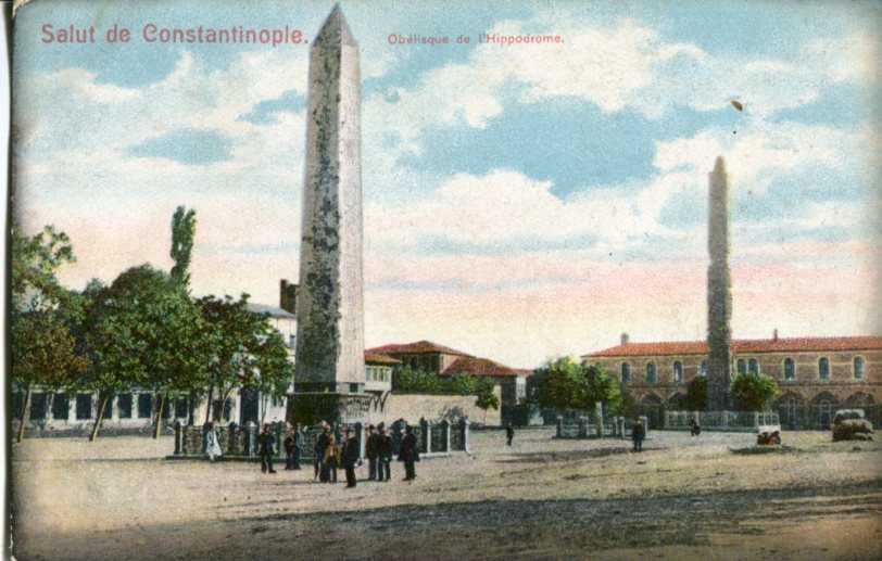 British Levant: 1908 (4 April). Postcard titled ‘Obelisque de l’Hippodrome’ to England franked with pair of 1/2d yellowish-green KEVII stamps tied by BPO Constantinople datestamp. Sg. Z161